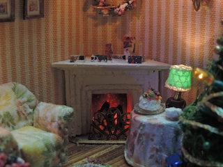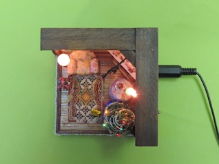 (9) 壁灯を取り付け、暖炉には薪を載せます。壁灯は3Vの麦球、暖炉の中には赤色LEDが仕込んであります。