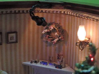 (11) 暖炉の上にキャンドル台、リースを飾ります。暖炉の上が暗くなってしまうのでスポットライトを取り付けました。
